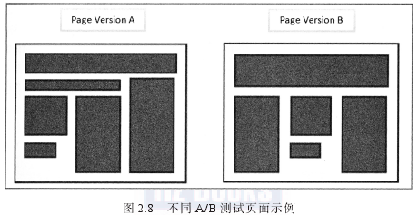 大部分在線營銷人員都從使用這種更簡單的測試形式開始,然后再進化到更復雜的測試類型,如多變量測試(下面將做說明)。圖2.8展示了一個例子,兩個不同風格的頁面在A/B測試中進行比較,它們的模塊布局、橫幅和圖片都不同 。