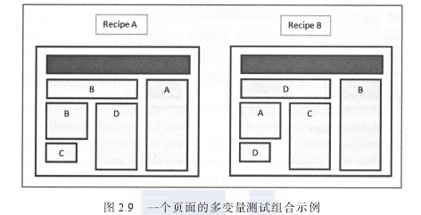 圖2.9展示了可以在網(wǎng)站設計多變量測試中同時測試的兩個頁面元素組合(每個模塊用不同的字母標注).測試可以找出表現(xiàn)最佳的元素組合 。