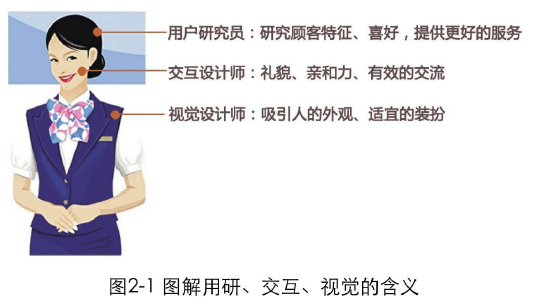 好的用戶體驗,就如同彬彬有禮的服務人員,不但能馬上解決用戶的問題,其優(yōu)美的談吐、機智的反應,也會給用戶一次非常美妙的體驗。如果把產品比做圖2-1左側的這個服務人員,那么這3個職位的作用正如圖中所描述的那樣。
