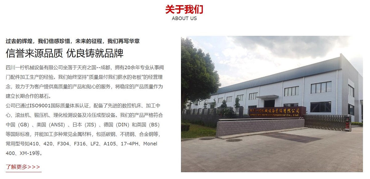 四川一檸機(jī)械設(shè)備有限公司坐落于天府之國(guó)--成都,擁有20余年專(zhuān)業(yè)從事閥門(mén)配件加工生產(chǎn)的經(jīng)驗(yàn)。我們始終堅(jiān)持“質(zhì)量是付我們薪水的老板”的經(jīng)營(yíng)理念,致力于為客戶提供高質(zhì)量的產(chǎn)品和貼心的服務(wù),將穩(wěn)定的產(chǎn)品質(zhì)量作為建立長(zhǎng)期合作的基石。