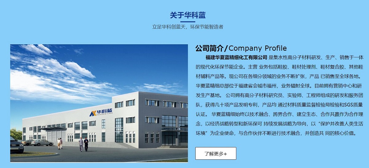福建華夏藍(lán)精細(xì)化工有限公司 是集水性高分子材料研發(fā)、生產(chǎn)、銷(xiāo)售于一體的現(xiàn)代化環(huán)保節(jié)能企業(yè)。主營(yíng) 業(yè)務(wù)包括鞋膠、鞋材處理劑、鞋材復(fù)合膠、其他鞋材輔料產(chǎn)品等。現(xiàn)公司在各細(xì)分領(lǐng)域的業(yè)務(wù)不斷擴(kuò)張,產(chǎn)品 已銷(xiāo)售至全球各地。