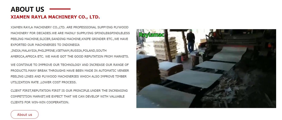 XIAMEN RAYLA MACHINERY CO.,LTD. ARE PROFESSIONAL SUPPYING PLYWOOD MACHINERY FOR DECADES.WE ARE MAINLY SUPPLYING SPINDLE&SPINDLELESS PEELING MACHINE,SLICER,SANDING MACHINE,KNIFE GRINDER ETC.,WE HAVE EXPORTED OUR MACHINERIES TO INDONESIA ,INDIA,MALAYSIA,PHILIPPINE,VIETNAM,RUSSIA,POLAND,SOUTH AMERICA,AFRICA ETC. WE HAVE GOT THE GOOD REPUTATION FROM MARKETS.
