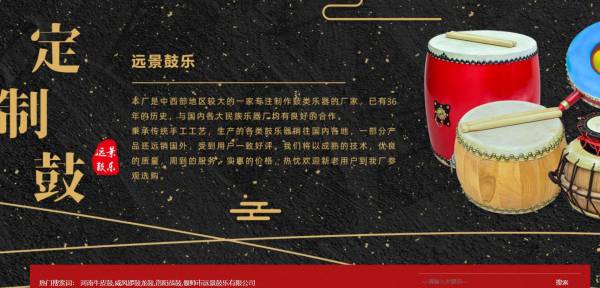 偃師市遠(yuǎn)*鼓樂(lè)有限公司選用我司企業(yè)樂(lè)器培訓(xùn)行業(yè)的網(wǎng)站優(yōu)化產(chǎn)品,其SEO關(guān)鍵詞有 河南牛皮鼓,威風(fēng)鑼鼓龍鼓,洛陽(yáng)戰(zhàn)鼓,偃師市*景鼓樂(lè)有限公司。其特點(diǎn)是用很合適的展示方式、展示效果、站點(diǎn)框架,把客戶(hù)及其用戶(hù)很關(guān)心的問(wèn)題突出表現(xiàn);并以簡(jiǎn)潔明朗的設(shè)計(jì)風(fēng)格,清晰展現(xiàn)公司水平實(shí)力,確保一秒抓住目標(biāo)用戶(hù)眼球,給用戶(hù)留下良好的第一印象。偃師市遠(yuǎn)*鼓樂(lè)有限公司成立于2012年,是經(jīng)偃師市市場(chǎng)監(jiān)督管理局審核的有資質(zhì)的公司,其統(tǒng)一社會(huì)信用代碼:9141038159***262X5。公司地址:河南省偃師市馬屯工業(yè)區(qū)。