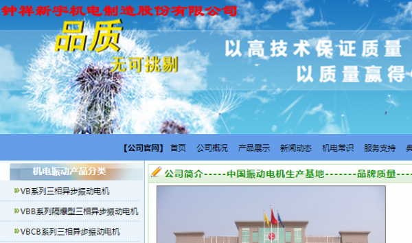 鐘祥新宇機電制造股份有限公司選用我司企業(yè)寵物用品網(wǎng)站案例,其網(wǎng)站建設(shè)的特點是電機、振動電機、振動機械及其配件的制造和修理,機械制造。為企業(yè)量身定制響應(yīng)式網(wǎng)站、品牌型網(wǎng)站、網(wǎng)站建設(shè)、營銷型網(wǎng)站、用最前沿的技術(shù)制作高品質(zhì)網(wǎng)站。鐘祥新宇機電制造股份有限公司成立于1968年,是經(jīng)鐘祥市場監(jiān)督管理局審核的有資質(zhì)的公司,其統(tǒng)一社會信用代碼:91420800722076699Q。公司地址: 鐘祥市經(jīng)濟開發(fā)區(qū)西環(huán)二路。